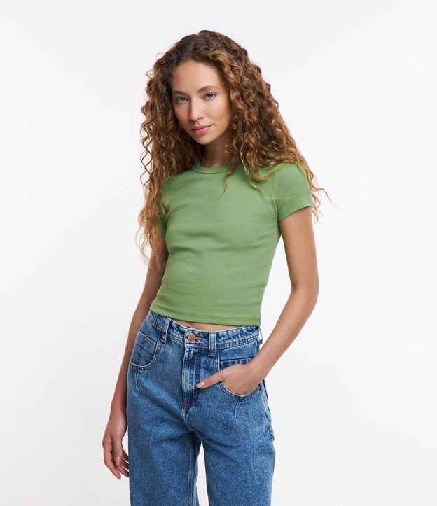 Blusa Canelada em Ribana com Manga Curta Verde Médio