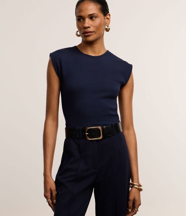 Blusa Canelada em Ribana com Manga Sem Cava Azul Marinho