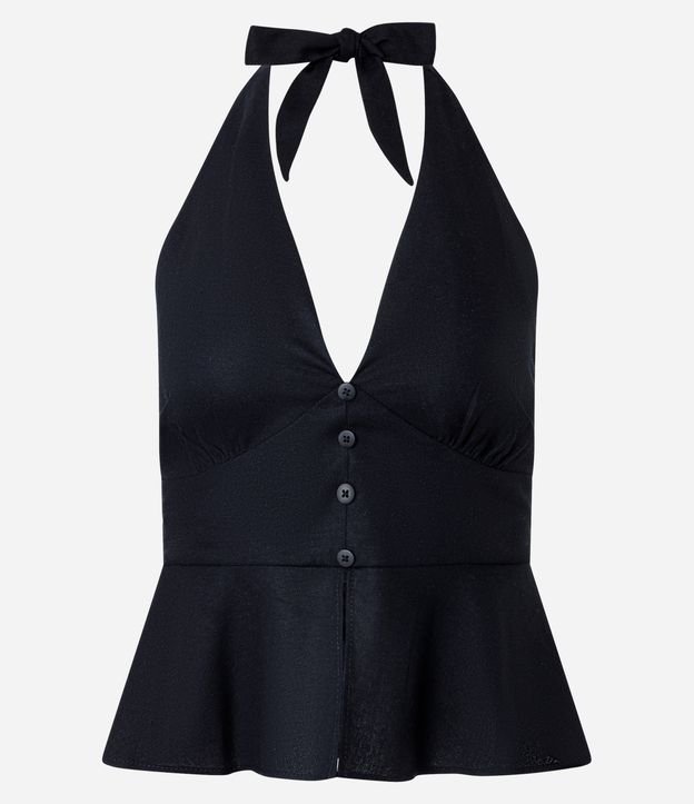 Blusa colete feminina confeccionada em viscose certificada através de boas práticas ambientais. Possui modelagem frente única, sem mangas, decote em V profundo, amarração no pescoço, fechamento frontal por botões e recorte abaixo do busto. Apresenta lastex posterior para ajuste e barra com leve babado.