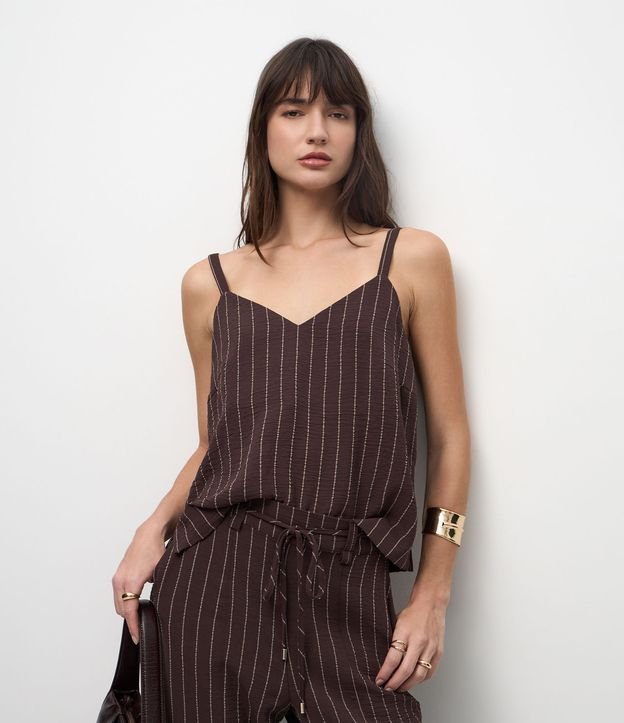 Blusa com Alças Largas e Estampa Listras em Fio Tinto Marrom
