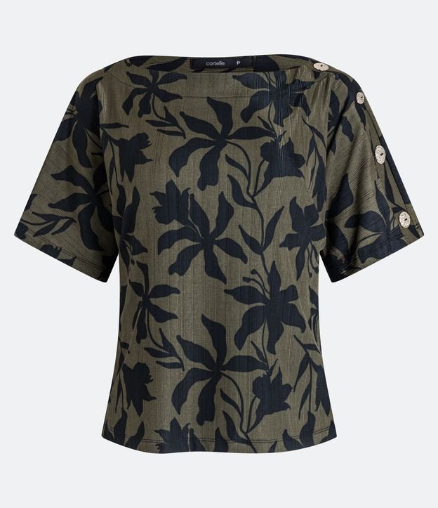 Blusa com Gola Canoa Manga com Botões e Estampa de Folhagens