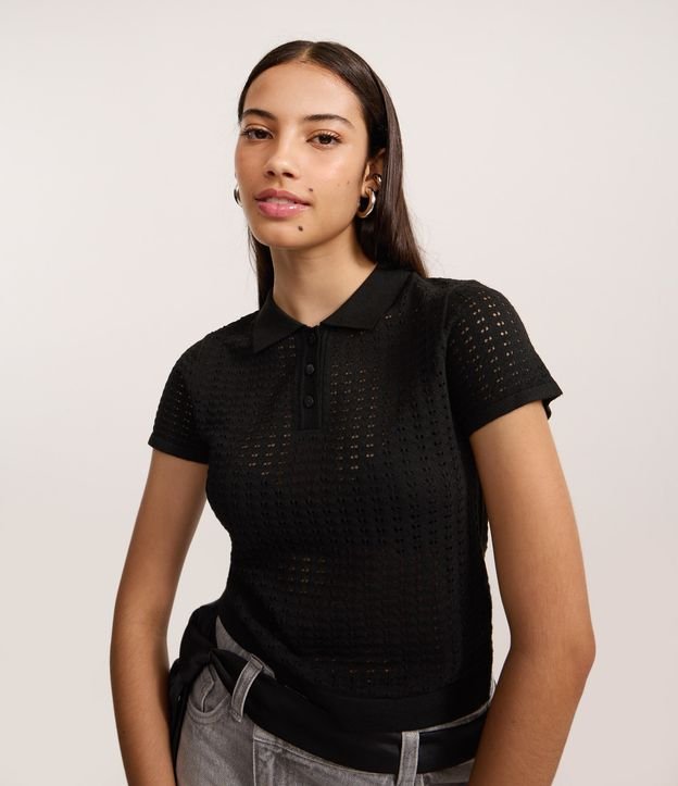 Blusa com Gola Polo em Tricô Ponto Aberto Preto