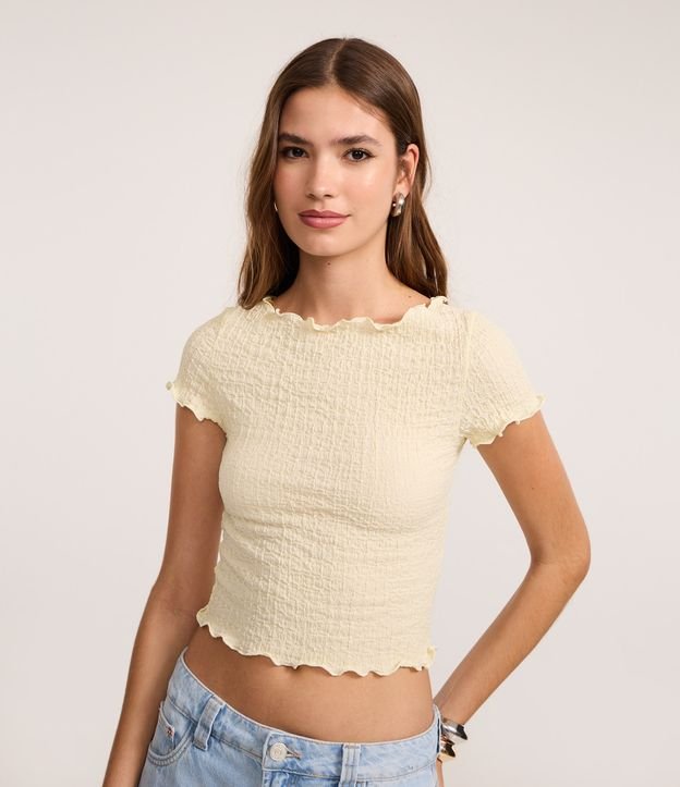 Blusa feminina com decote ombro a ombro, manga curta, textura e ondinhas nos viés.