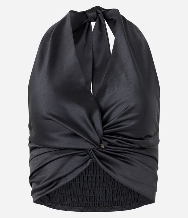 Blusa Cropped Acetinada com Amarração no Pescoço e Nózinho no Decote