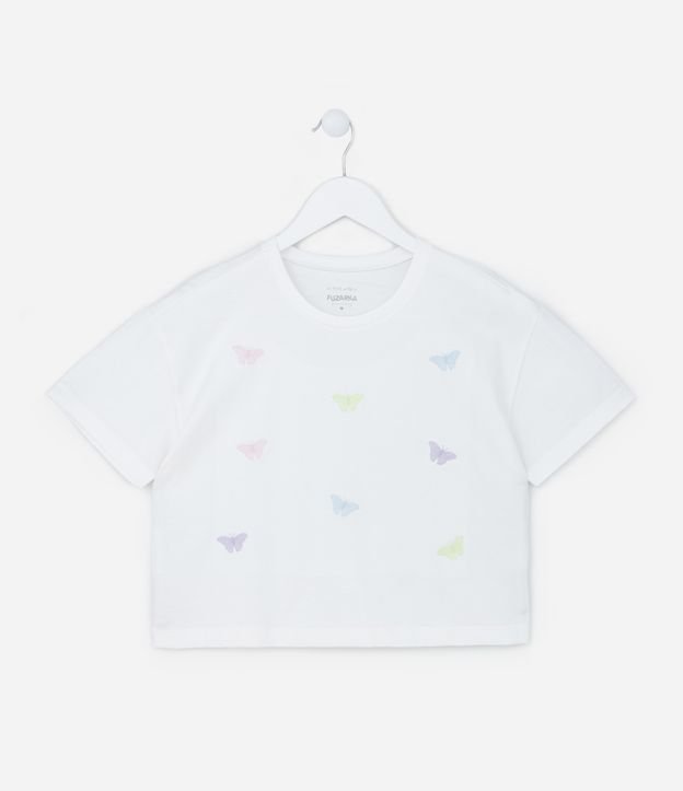 Blusa Cropped Comfort Infantil em Algodão com Bordado de Borboletas - Tam 5 a 14 anos Branco