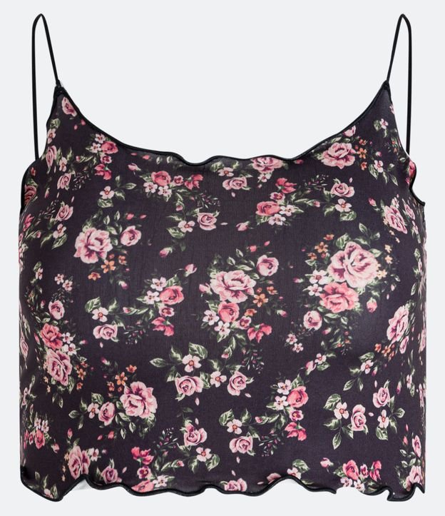 Blusa Cropped de Alça em Microfibra com Estampa Floral Preto