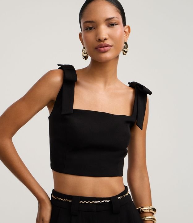 Blusa Cropped em Crepe com Laço na Alça Larga Preto