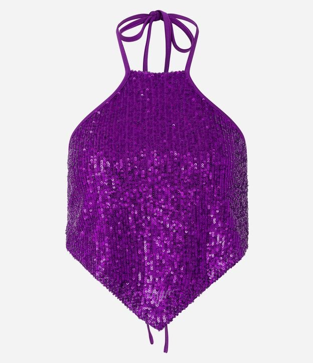 Blusa Cropped em Paetê Metalizado e Gola Halter com Barra Ponta