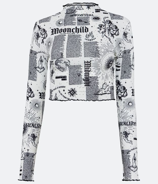 Blusa Cropped em Ribana Estampa Mística com Ícones e Escritas