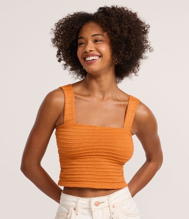 Blusa Cropped em Tricô com Brilhos e Texturizada Laranja