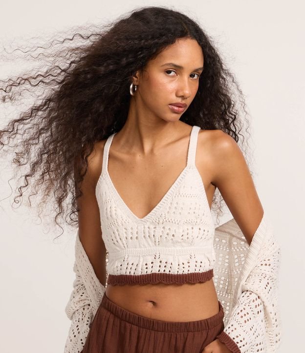 Blusa cropped em tricô com decote em v, alças finas transpassadas e barra contrastantes.