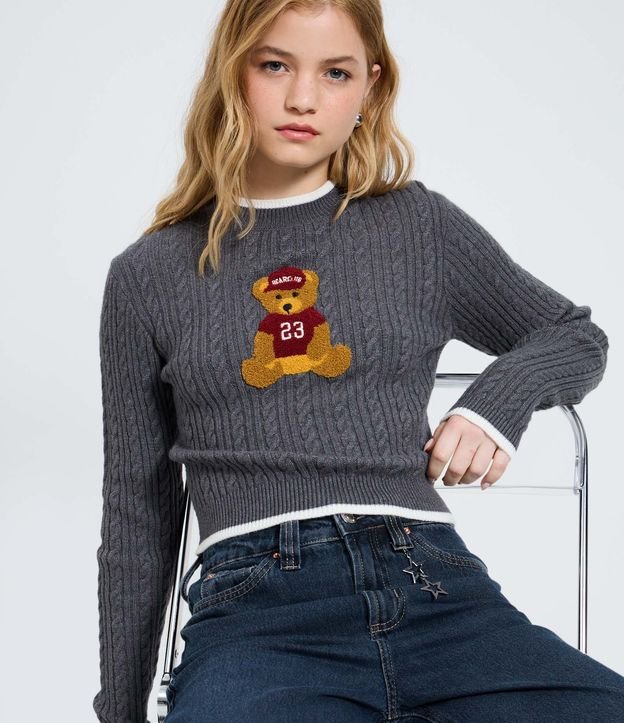 Blusa Cropped em Tricô com Estampa de Urso Cinza