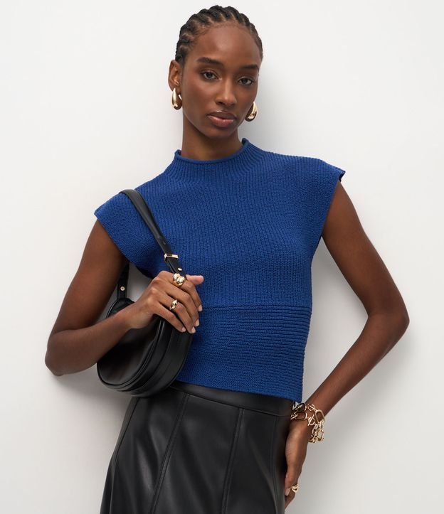 Blusa Cropped em Tricô Texturizado com Ombreira Azul
