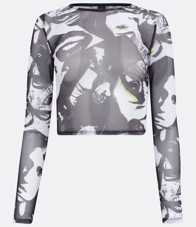 Blusa Cropped em Tule com Manga Longa e Estampa de Rostos