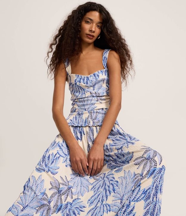 Blusa feminina confeccionada em viscose certificada no modelo cropped, decote em v, alças médias, estampa de folhas, lastex nas costas e textura.