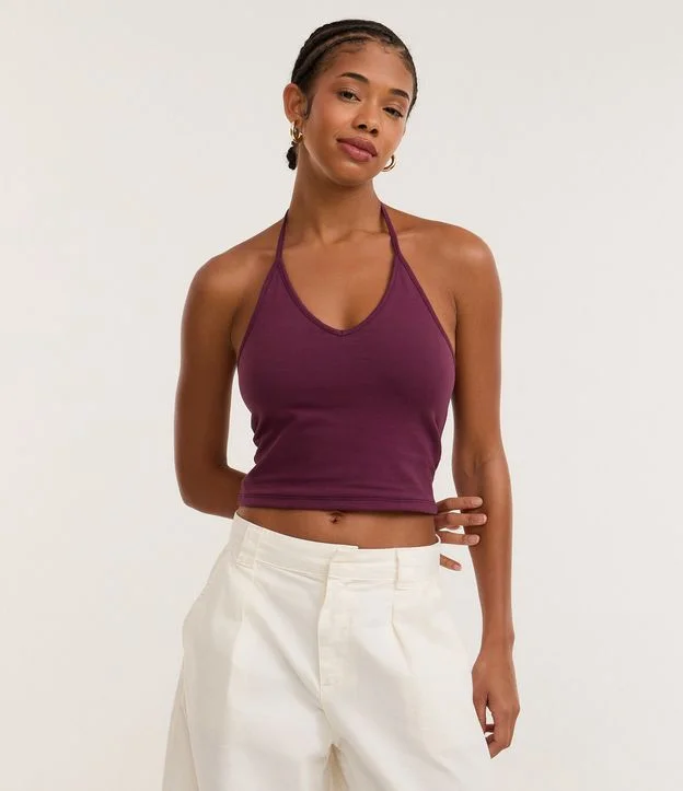 Blusa Cropped Frente Única em Cotton com Amarração Roxo