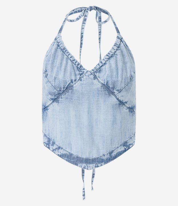 Blusa Cropped Jeans com Busto Marcado e Amarração no Pescoço