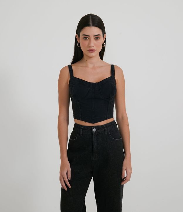 Blusa Cropped Jeans com Recorte no Busto e Zíper Frontal