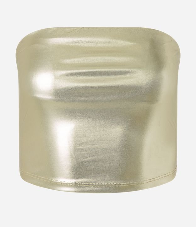 Blusa cropped em malha metalizada, tomara que caia e sem estampa.