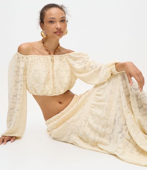 Blusa Cropped Ombro a Ombro em Jacquard Floral Bege