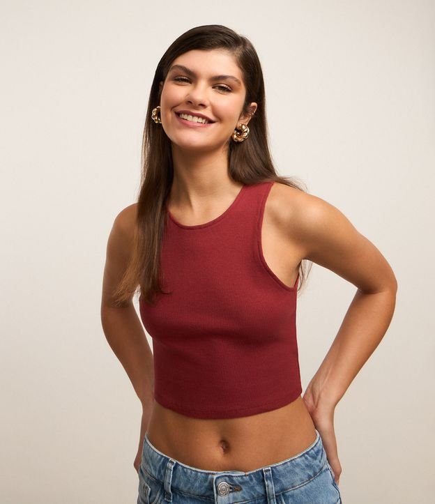 Blusa Cropped sem Manga em Algodão com Textura Canelada Vermelho