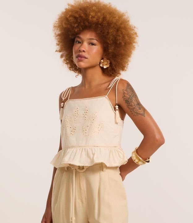 Blusa feminina curta confeccionada em algodão certificado. Possui alças finas com amarração e tassel nas pontas, bordado frontal e babadinho na barra.