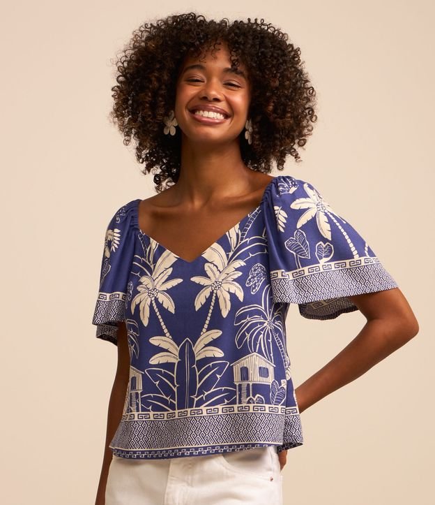 Blusa Curta em Viscose e Linho com Estampa Tropical