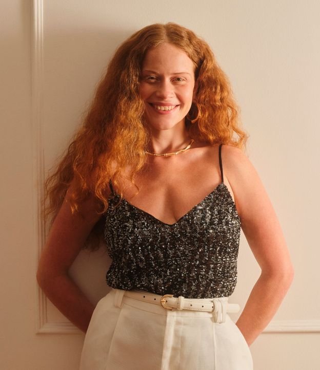 Blusa de Alça com Paetês Metalizados e Decote V