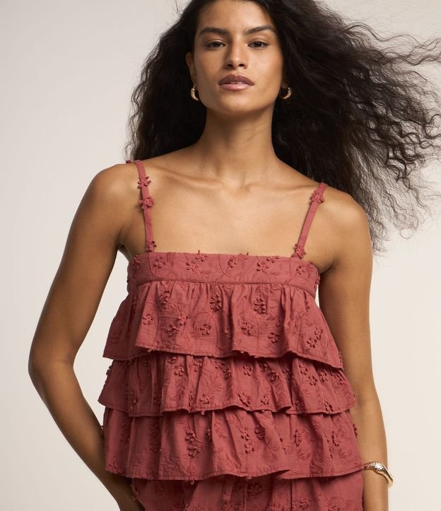 Blusa com alça fina em tricoline com babados e bordado floral.