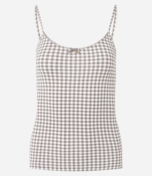 Blusa de pijama feminina em microfibra, sem mangas, com alças finas e estampa xadrez. Possui caimento confortável, toque suave e detalhe delicado de laço com plaquinha frontal, ideal para compor looks leves e aconchegantes para descanso.