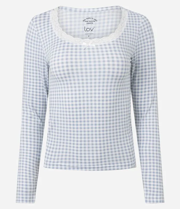 Blusa feminina de pijama confeccionada em peach touch mais sustentável, no modelo regular. Possui gola redonda, com renda, manga longa e estampa xadrez vichy.