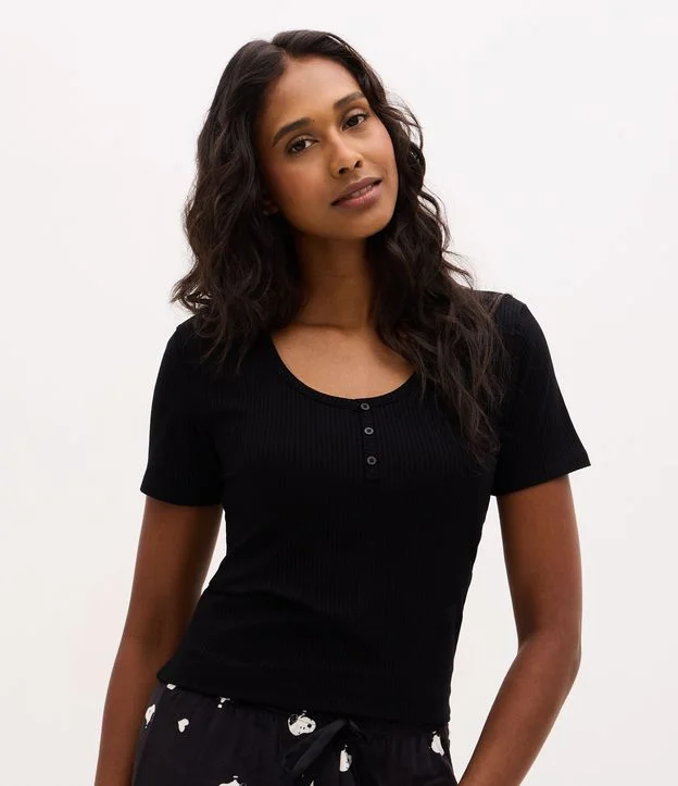 Blusa de Pijama em Ribana com Botões no Decote Preto