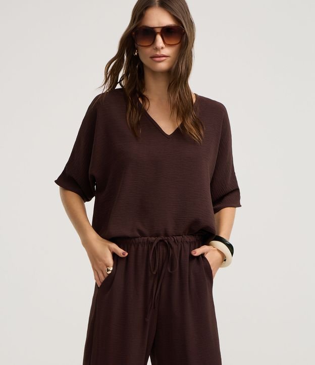 Blusa em Airflow com Decote V e Mangas Amplas Marrom