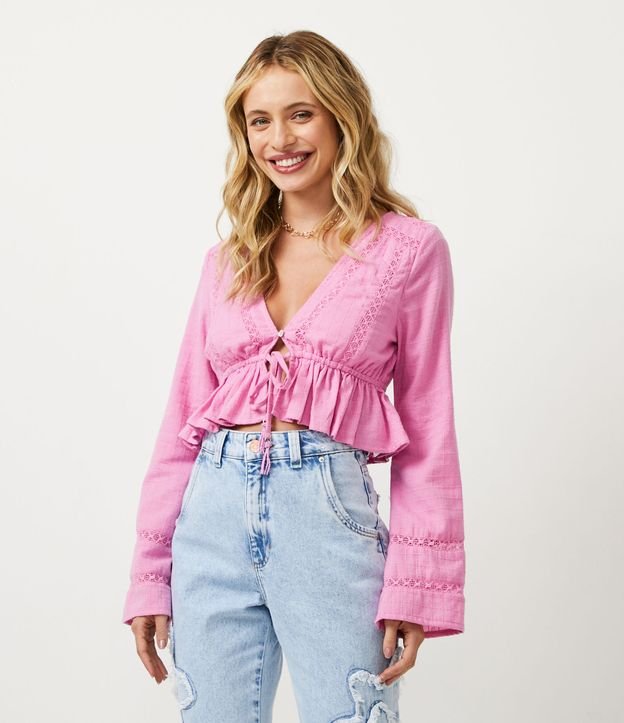 Blusa em Algodão com Entremeios Amarração Frontal e Babado
