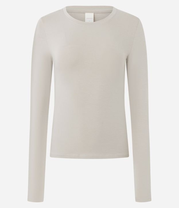 Blusa feminina, confeccionada em algodão, com gola redonda, mangas longas e superfície sem estampa.