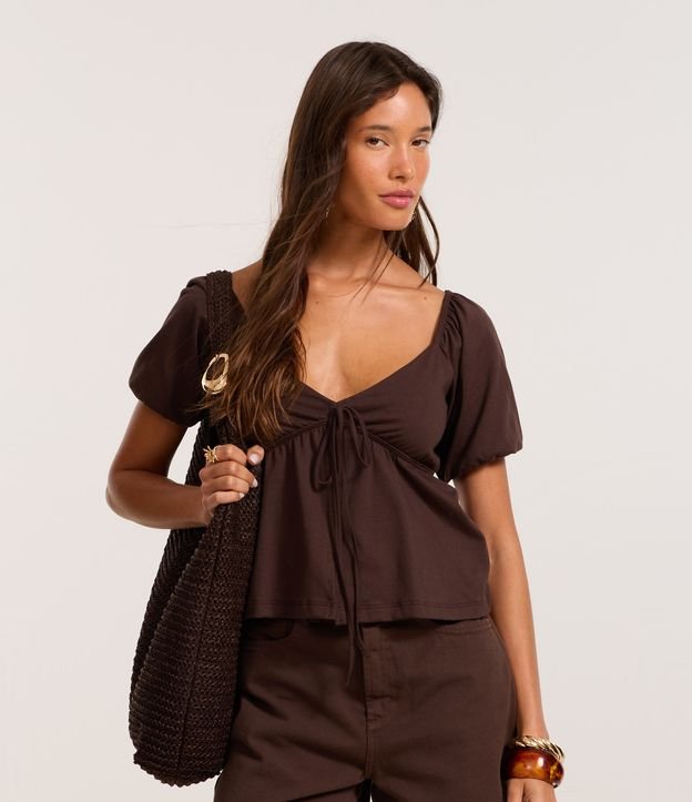 Blusa em Algodão com Mangas Bufantes e Amarração Frontal Marrom