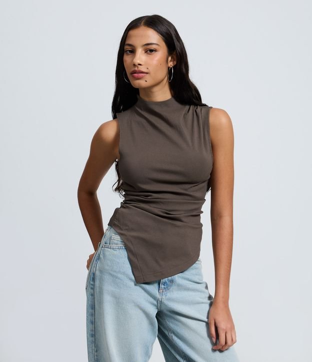 Blusa em Bengaline com Golinha e Barra Assimétrica Marrom