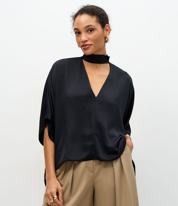 Blusa em Cetim com Gola Alta e Manga Esvoaçante Preto