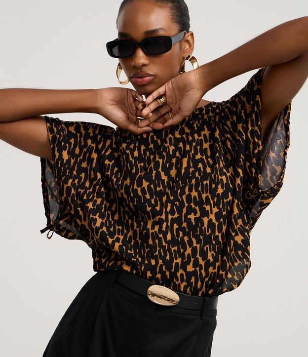 Blusa em Chiffon com Manga Ampla e Estampa Onça