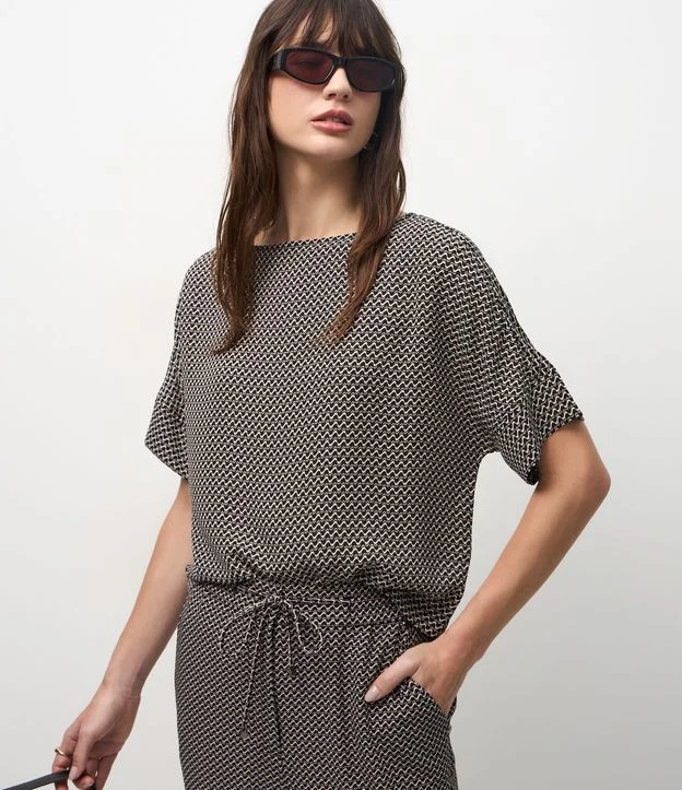 Blusa manga curta, confeccionada em chiffon e com estampa Pied-de-poule.
