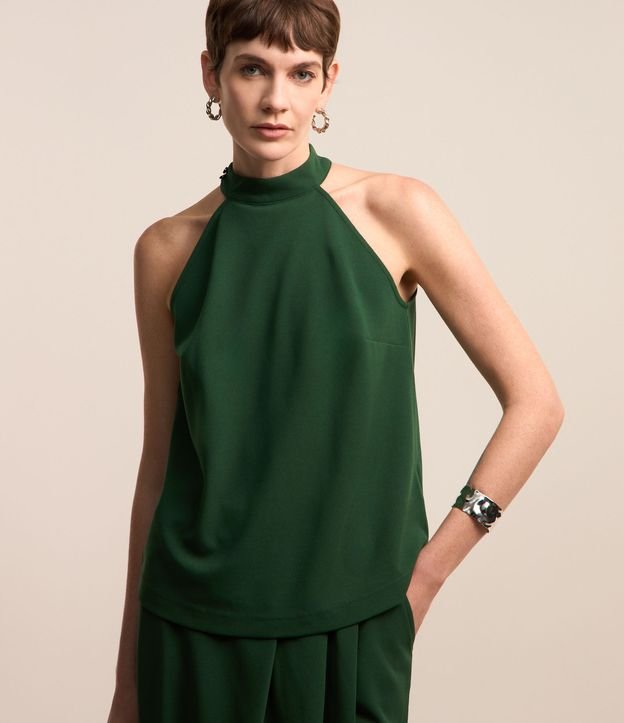 Blusa feminina, confeccionada em crepe, com golinha alta (halter) e superfície sem estampa.