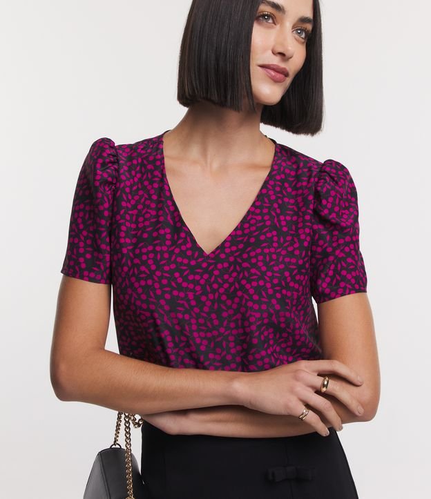 Blusa em Crepe com Manga Bufante e Estampa Mini Frutinhas