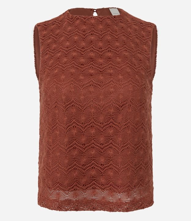 Blusa feminina sem manga confeccionada em crochê com trama detalhada e textura delicada. Possui alça larga, acabamento retilíneo na barra e fechamento posterior por botão.