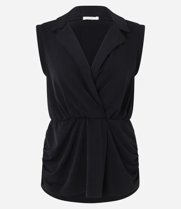 Blusa sem manga, confeccionada em helanca, gola v com lapelas e drapeados na cintura e na lateral.