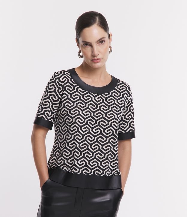 Blusa em Jersey com Detalhe em PU e Estampa Geométrica Preto/ Branco