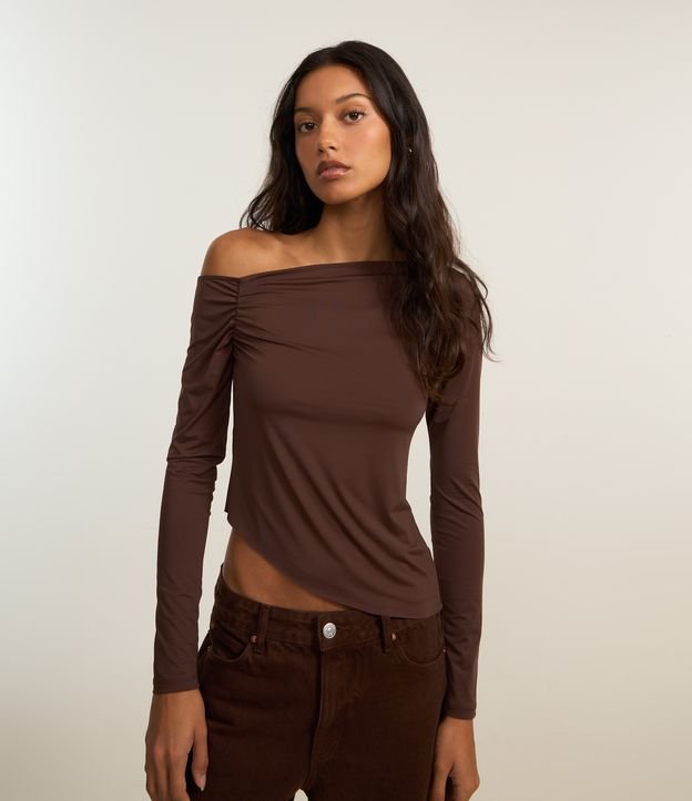 Blusa em Microfibra com Decote Assimétrico e Drapeado na Cava Marrom