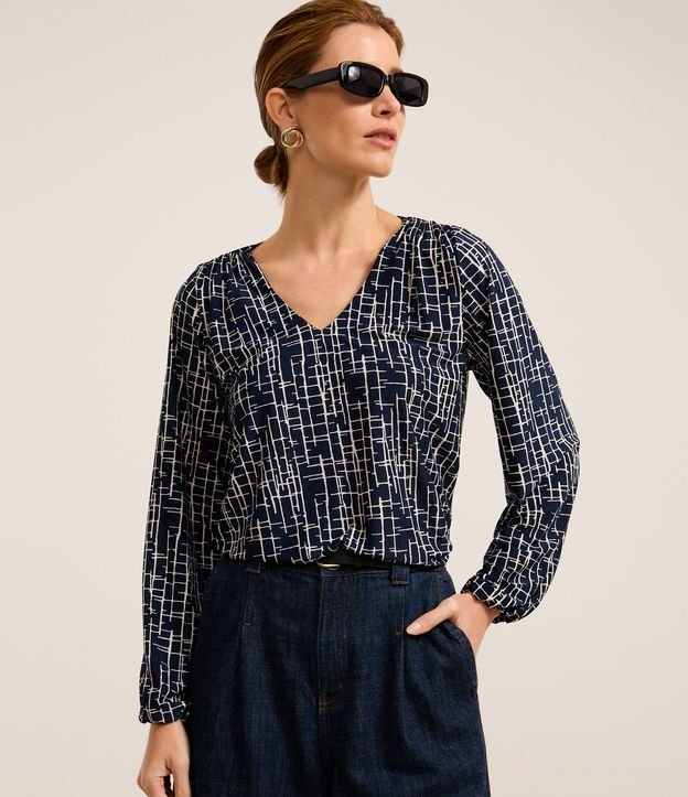 Blusa em Microfibra com Estampa Geométrica e Gola V Azul