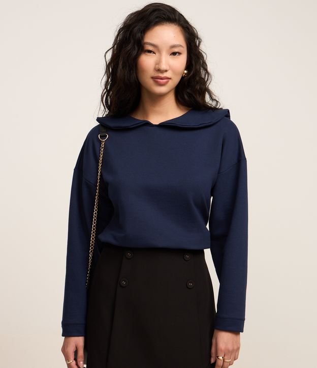 Blusa em Moletom com Gola Marinheiro Azul Marinho