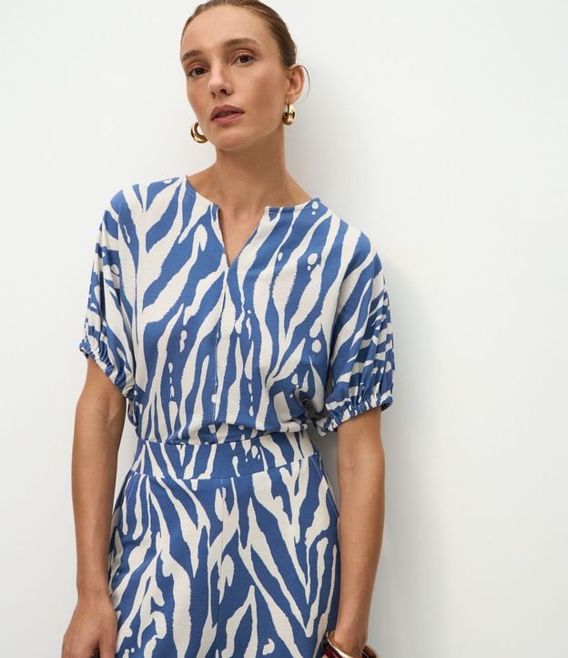 Blusa em Piquet com Elástico nas Mangas e Estampa Abstrata Azul
