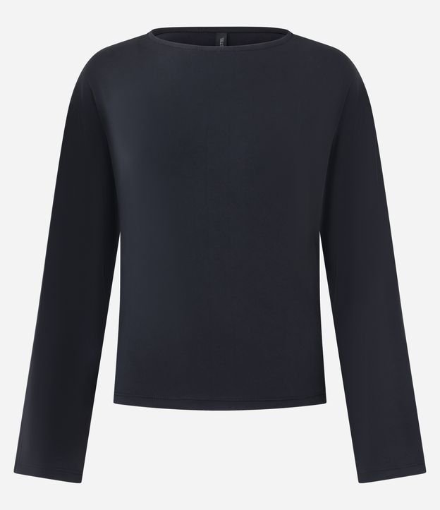 Blusa feminina confeccionada em poliamida, no modelo ajustado. Possui gola canoa, manga morcego e sem estampa.
